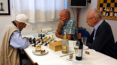 05.08.2014 Das gibt es nur im Schachsport. Warum Schach bis ins hohe Alter geistig fit hält, zeigt dieses Foto. Zu sehen sind das SKW-Gründungsmitglied Paul Boceck (90, links), er spielt gegen SKW-Bezirksligaspieler Gerhard Pietrek (79), und als Zuschauer der ebenfalls 90-jährige Leonhard Kowatsch. Zusammen macht das 259 Jahre geballte Schach-Erfahrung. Und der Kampfgeist ist so hoch, dass auch gegen Mitternacht noch keine Partie verloren gegeben wird.
